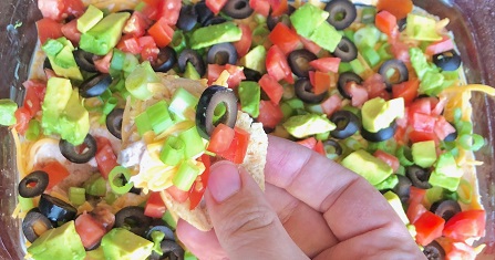 Spread beans in 7×11 glass pan or platter. Mix sour cream and taco seasoning for second layer. Third layer is cheese. Sprinkle rest of ingredients on top.