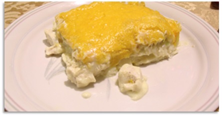 Cook cubed chicken. Add onion and cook until translucent. Mix in soup and water until bubbly and well mixed. Add sour cream to the sauce/gravy last. To assemble, spoon a little sauce and chicken in bottom of greased 9×13 pan. Then cover with a layer of 2 tortillas. Then spoon on a layer of sauce and chicken. Then a layer of 2 tortillas. Then a layer of sauce and chicken. Then 2 tortillas (for three layers of tortillas total). Finally, a thick layer of cheese on top. Bake at 375° for 20 minutes till cheese is melted and slightly brown. Optional: Top with salsa for extra flavor.