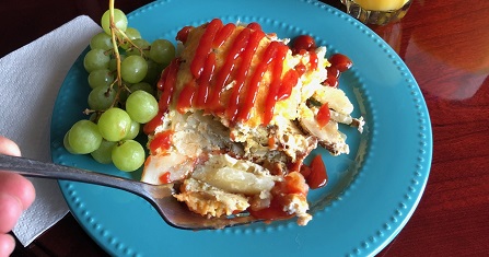 We usually made this in the Dutch oven while camping, but nowadays we often just make it in a pot in the oven. And it’s always delicious. You can have a pound of sausage and bacon, but we do find that it might be a little overwhelming and greasy with both. Also, you need lots of eggs. Otherwise, the eggs mostly just act like a binder. So if you can have more than 18, even better. *The one in the picture was made with 30 eggs, 8 oz. cheese, 2 gigantic potatoes, 1 lb. bacon, 1 onion, and ketchup on top. It definitely needed the ketchup, and it probably could’ve had a little less potato.