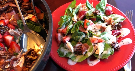 For the salad in the picture, I just used one package of spinach, 1 pound of strawberries, a package of bacon, 1 bunch of green onions, a rotisserie chicken, and I made my own candied pecans. And I used Kroger Poppy Seed dressing, much cheaper than Brianna’s.
