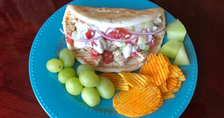 For the marinade/chicken: Mix all marinade ingredients and chicken together in a Ziplock bag and let marinate for a few minutes while you chop the rest of the vegetables for the toppings. Once everything is chopped, heat a heavy frying pan over high heat, then add chicken and cook until it’s done, about 7 minutes or so. Warm the pitas in the microwave for about 30 seconds.