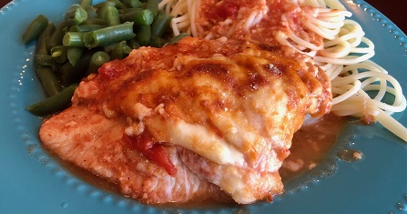 Pour sauce into a greased 9×13″ pan. Stir in 6 Tbsp. parmesan cheese. Lightly salt and pepper the chicken breasts. Add the chicken to the sauce and turn over to coat both sides. Top with mozzarella and remaining parmesan cheese. Bake at 375° for 40-55 minutes or until the chicken’s internal temperature reaches 165° and the cheese is melted and slightly brown. Serve over pasta.
