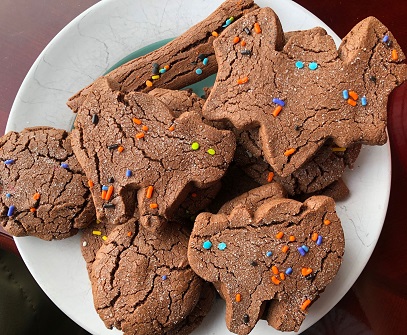 If a brownie married a sugar cookie, you’d get these wonderful chocolate cookies. I think these are called “Black Cat Cookies” because they started as a recipe from one of those Halloween recipe books many years ago, like the small ones you’d find at the checkout stand. I remember the cats had candy corn eyes and red hot candies for a nose. We’ve made those, but I’ve also used cookie cutters to make bats, witches, cats, and vampires. The dough holds pretty well with the cookie cutters even after baking in the oven–I don’t bother rolling out the dough; I just smash pieces of the dough flat with a cup and then cut them out with the cutter.