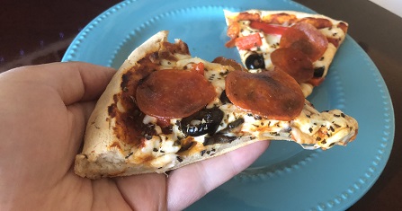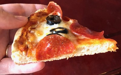 In any event, this recipe is great because you don’t need to wait for it to rise. You can also bake a crust and freeze it to top later. Of course you don’t get fluffy, airy crusts, but it’s easy, chewy, and delicious, and you can make it as thick as you want. That’s one of the things about gluten free crusts–a lot of restaurants use the Udi’s crust, which is fine but thin–more like a really thick tortilla. So it’s refreshing to make it thicker. Here’s a picture of the thickness that I make (the black specks are extra basil on top):