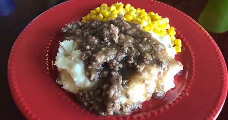 In a large deep skillet, brown the beef and add salt and pepper to taste. Add gravy and warm through. Serve with mashed potatoes and corn.