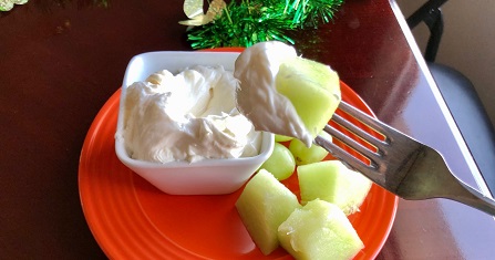Jeff’s family made this all the time growing up, and I love it–especially with apples. You could consider it an appetizer or dessert, since it’s such a sweet and delicious thing to serve with fruit. You can also make it more festive by adding food coloring–we colored it green for St. Patrick’s Day.