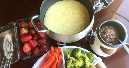 We’ve done fondue as a date and as a family activity a few times, and they’ve all been very fun. Of course traditionally it’s made with wine and Kirsch, but we leave out the alcohol and replace it with chicken broth. It’s best if you melt the cheese or chocolate before placing it in the fondue pot or slow cooker–and it’s also best if you slice everything before making the melted cheese. The cheese does tend to eventually turn into a lump after a long time of sitting, so the less sitting the better.
