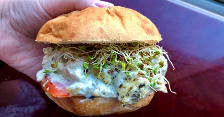 In a frying pan, cook the chicken then place in a bowl (leaving in pan melts the mayo to oil). To the chicken, add the red pepper, almonds, pesto, and mayo, and mix until combined. If you’re not making a panini, place your bread on a cookie sheet and broil slightly before assembling the sandwich. If you are making a panini, preheat your machine while you assemble. On the bottom half of the ciabatta roll, layer on your muenster cheese, chicken mixture, tomato (seasoned with salt and pepper), and alfalfa sprouts. Top with the other half of the roll, then carefully place in the panini maker or George Foreman and cook for a few minutes until the bread is toasted.