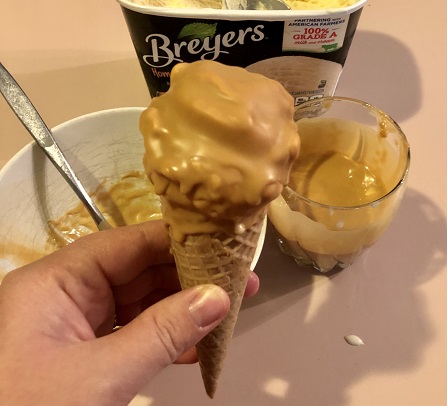When I was growing up, my favorite dipped cone at Dairy Queen was butterscotch. But of course they discontinued it. And they don’t do cherry anymore either. But I’d heard that all you need to make Magic Shell is baking chips and coconut oil. And you know what? They’re right! It’s so easy! If you want to dip, just get a glass and make sure your scoops are secured well before dipping. Hurray for the return of my butterscotch dipped cones!