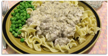 Brown the ground beef, adding onion and garlic to cook until soft. Sprinkle with paprika, salt, and pepper. Add soup and milk. Add sour cream at last minute to heat through. Serve on noodles (or rice or potatoes)–FYI, sometimes it makes a lot and you’ll need more than one package of pasta.