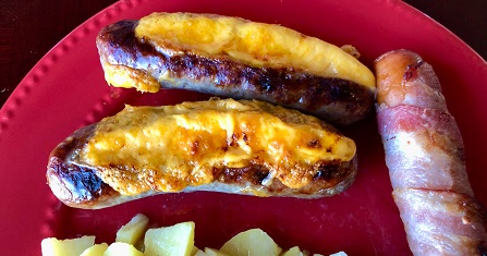 For the easiest version, buy cheddar hot dogs and simply wrap them with bacon. OR Slice hot dogs down middle, place cheese in middle, then wrap in bacon, making sure to tuck the ends so the bacon doesn’t unravel. Broil or grill on medium heat for 5 minutes on each side, turning halfway.