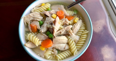 In large pot, cover chicken with water. Place bouillon cubes, bay leaves, carrots, and onion in water. Optional: Add 2 whole stalks of celery for flavor. Boil for 1 hour, occasionally skimming off foam on top. Remove bay leaves and celery, then remove celery stalks and chicken from water and let cool in a pan for about 20 minutes. (Cools faster if you use a spoon to separate off large chunks while hot.) Once cool, pull chicken off bone and place bite-size chunks in broth. Add salt and pepper to taste. Soup always needs lots of salt and sometimes another bouillon cube or two for flavor. Add egg noodles and boil for 8 minutes, then remove from heat and add peas and corn–or cook the gluten free noodles separately and add them to each person’s bowl individually before adding broth.